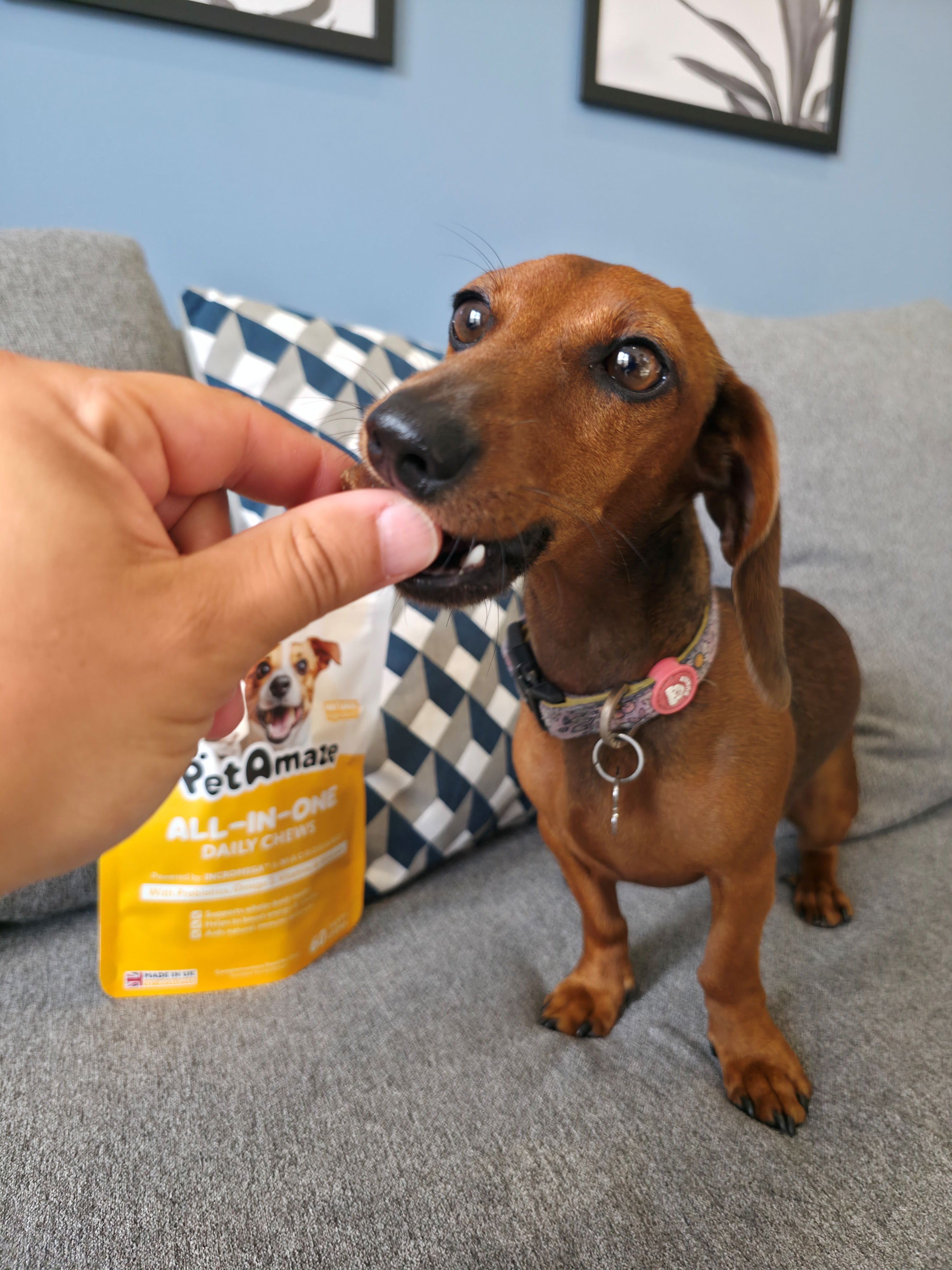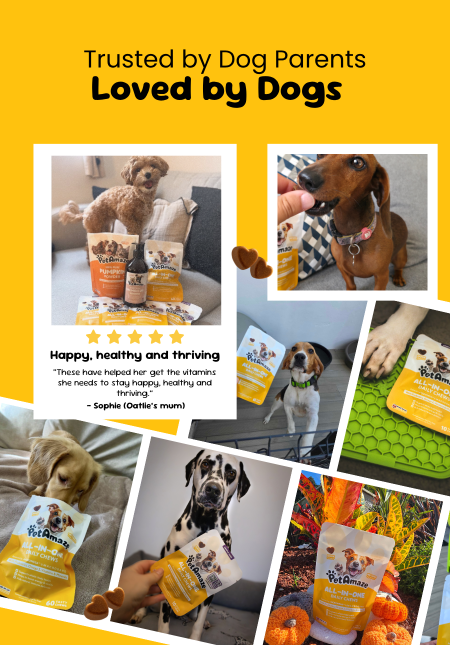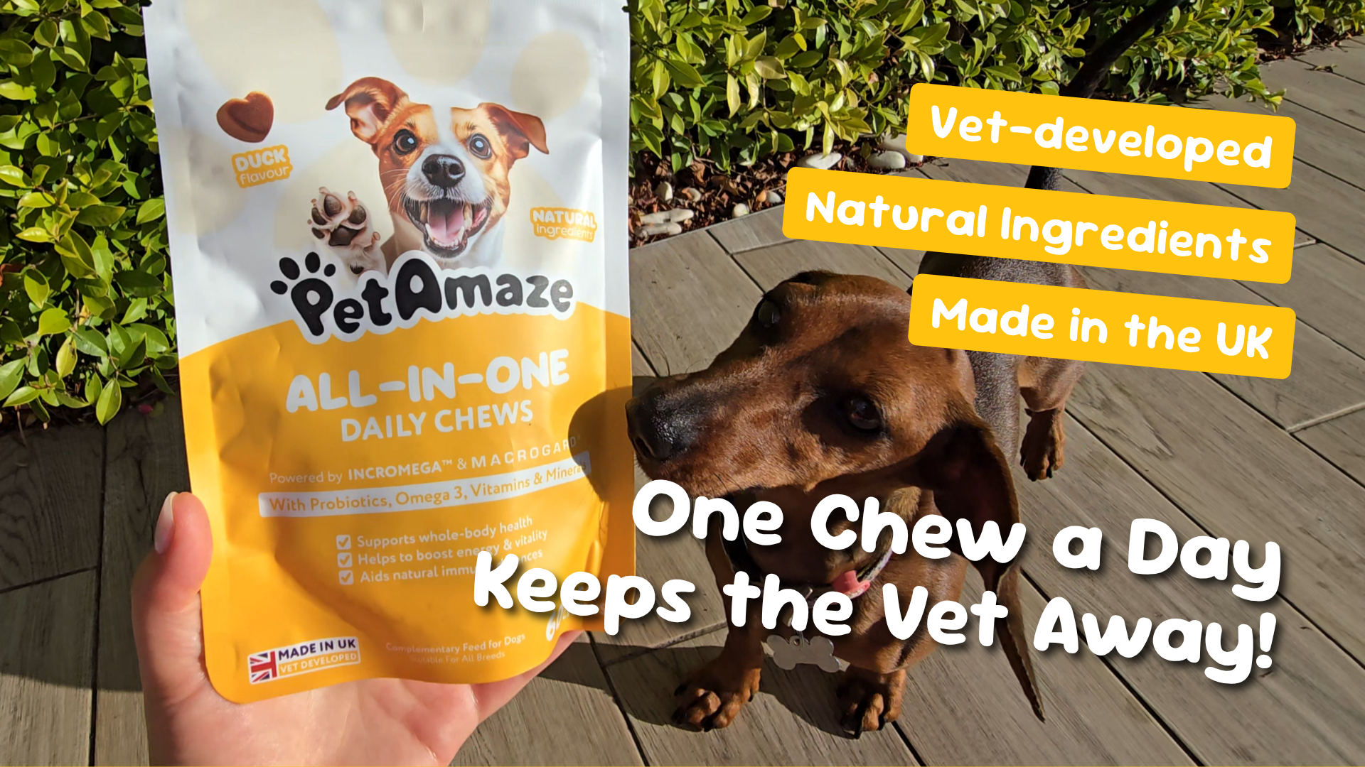 PetAmaze's All-in-One Daily Chews are formulated as a comprehensive daily supplement for joint, digestive, skin, and immune support. Always consult a vet before giving any complementary feed to your dog, or when changing their diet.