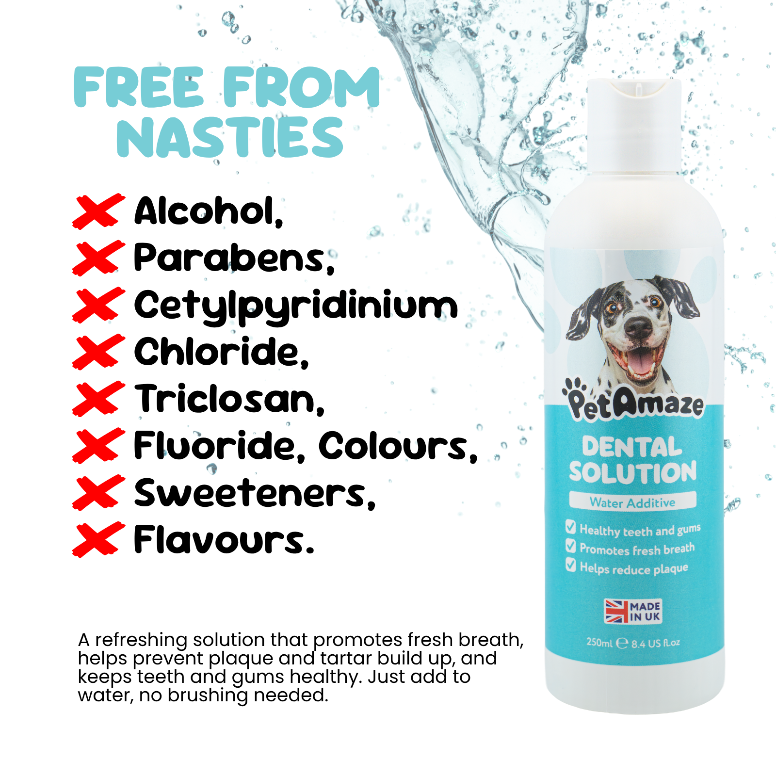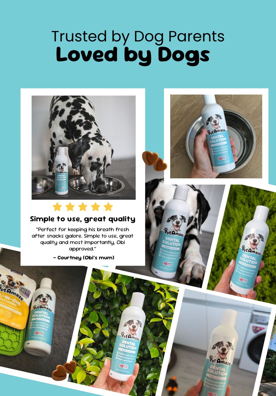 Tired of bad doggy breath? Brushing battles? Say hello to fuss-free oral care with the PetAmaze Dental Water Additive – your daily solution for fresher breath, cleaner teeth, and happier gums. Simply add to your dog’s water bowl and let it work while they drink!